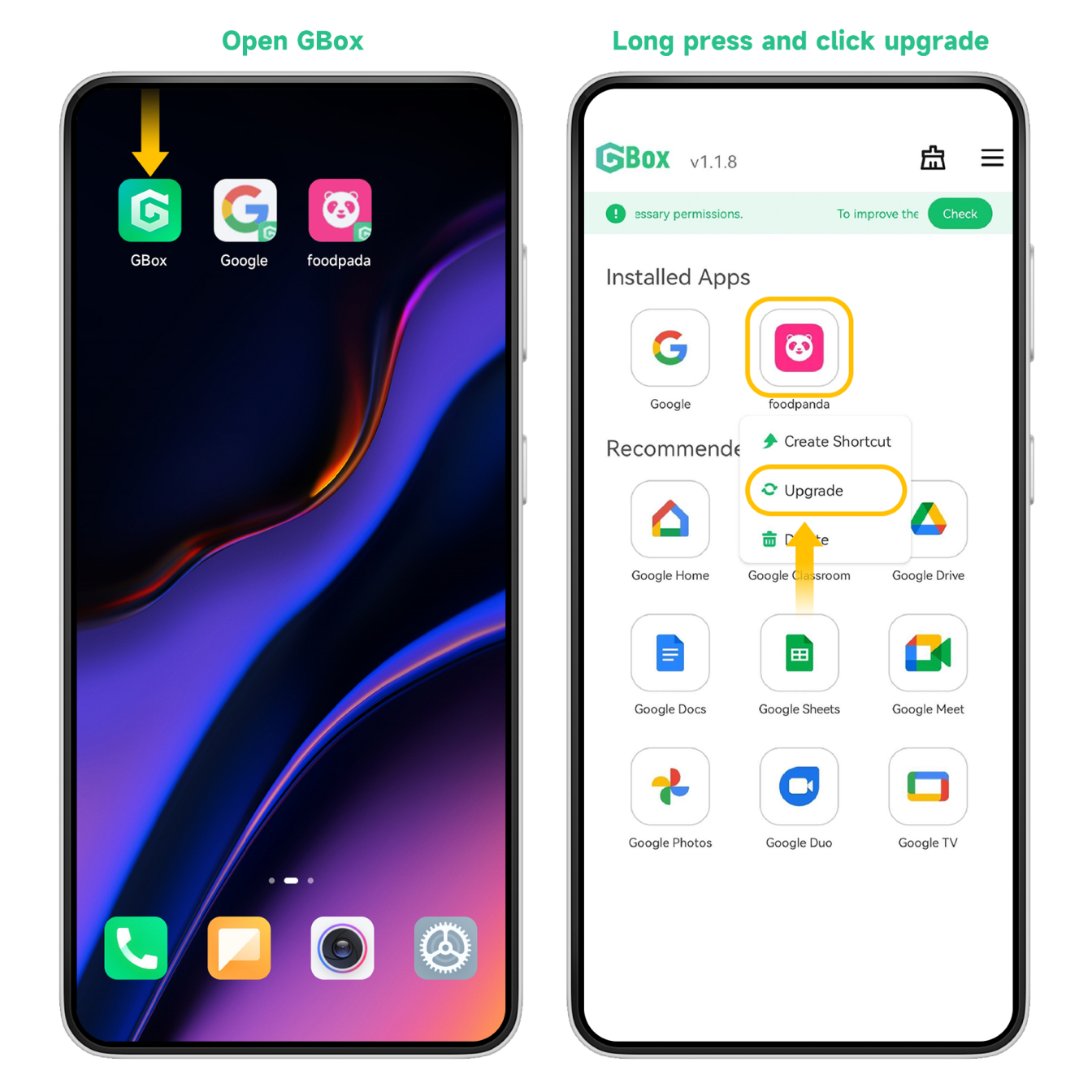 How can I update the app added in GBox? If you open an app from Gbox that requires an update, you can update the app through Google Play normally. If you want to manually update an installed app, please long-press the app icon on the homepage and choose the update option. If an update is available, you can confirm it.