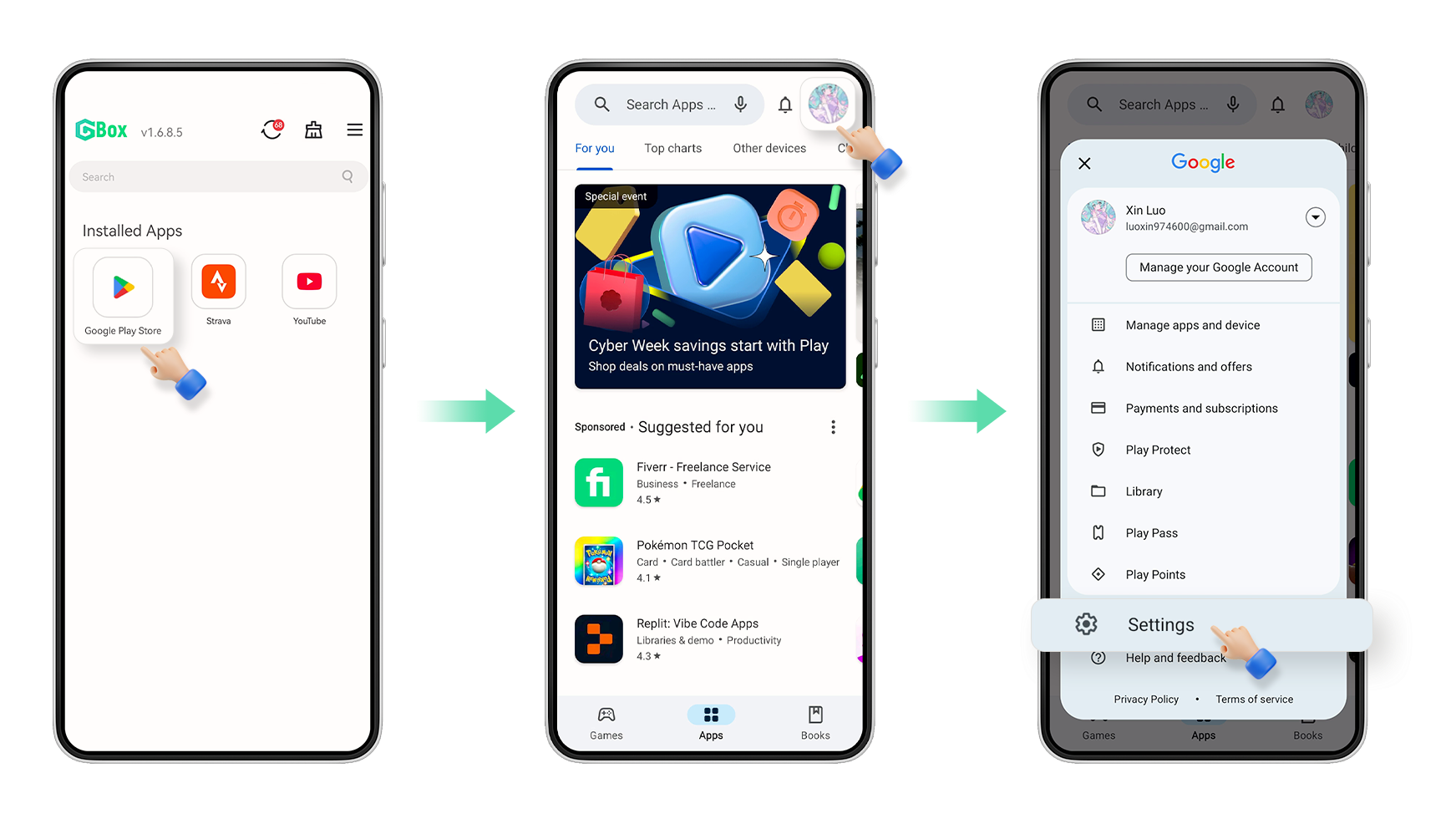 1. Tap "Google Play," tap your account icon, and tap "Settings."