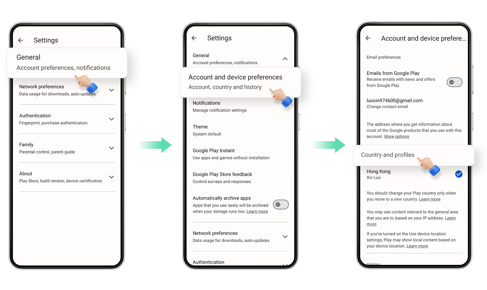 2. Tap "General," then tap "Account and device preferences" to view your region.