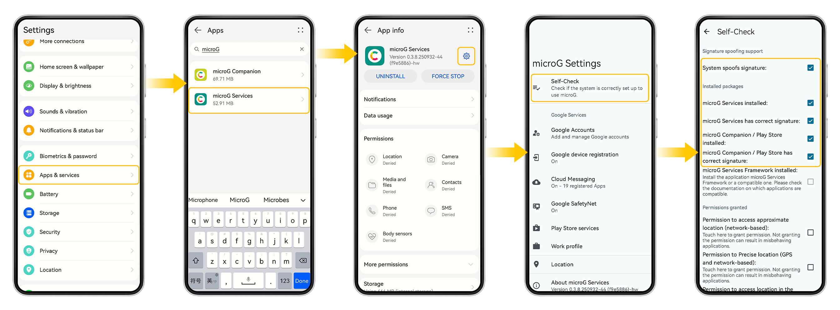 Шаг 2: Перейдите в Настройки телефона > Приложения и службы > microG > Настройки microG > Самопроверка > Установленные приложения, и убедитесь, что первые четыре пункта отмечены галочкой (√).Если microG уже установлен, переходите сразу к шагу 3.