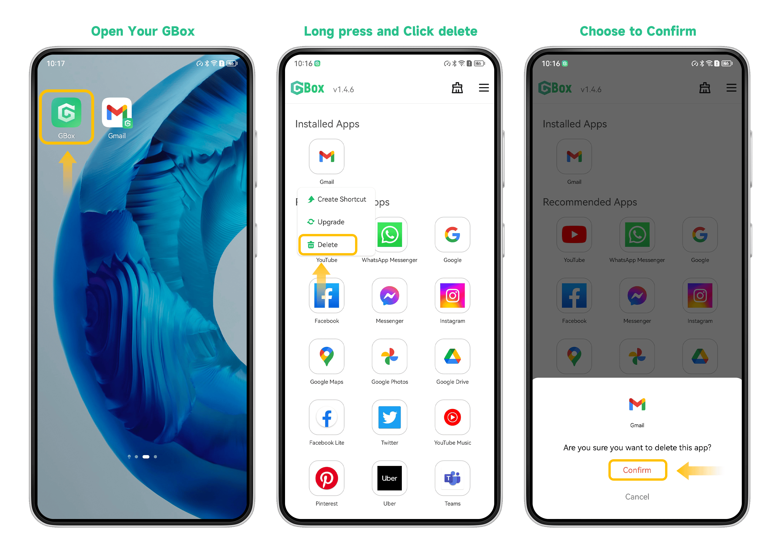 How can I delete the app added in GBox? To delete an app in GBox, simply long-press on the app you wish to delete from installed apps of GBox homepage . You will then be presented with the option to delete and confirm.