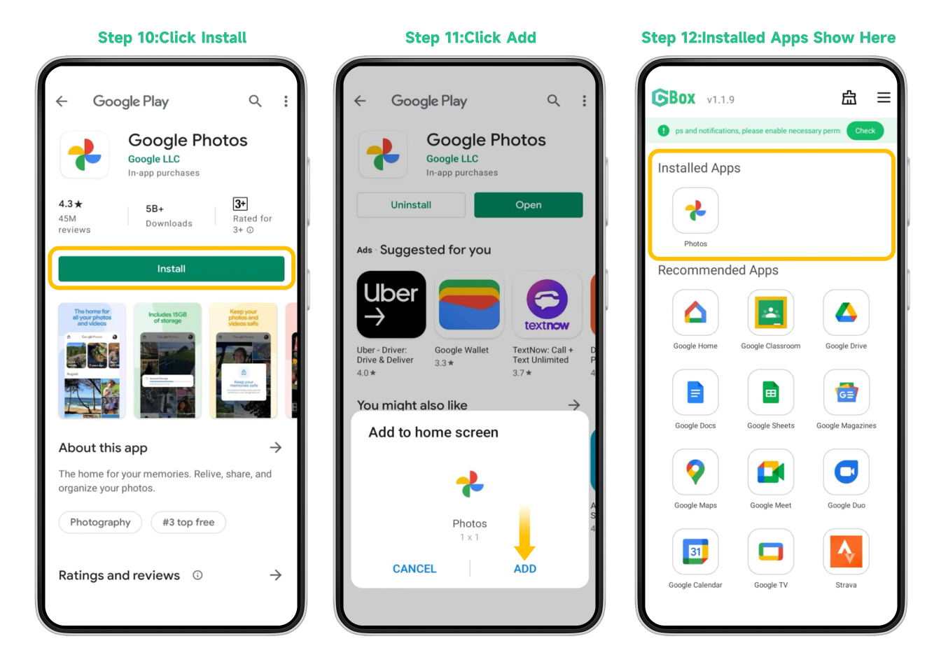 4.1.Install the app you need. Add the app to home screen. Next time you can open the app from GBox homepage.