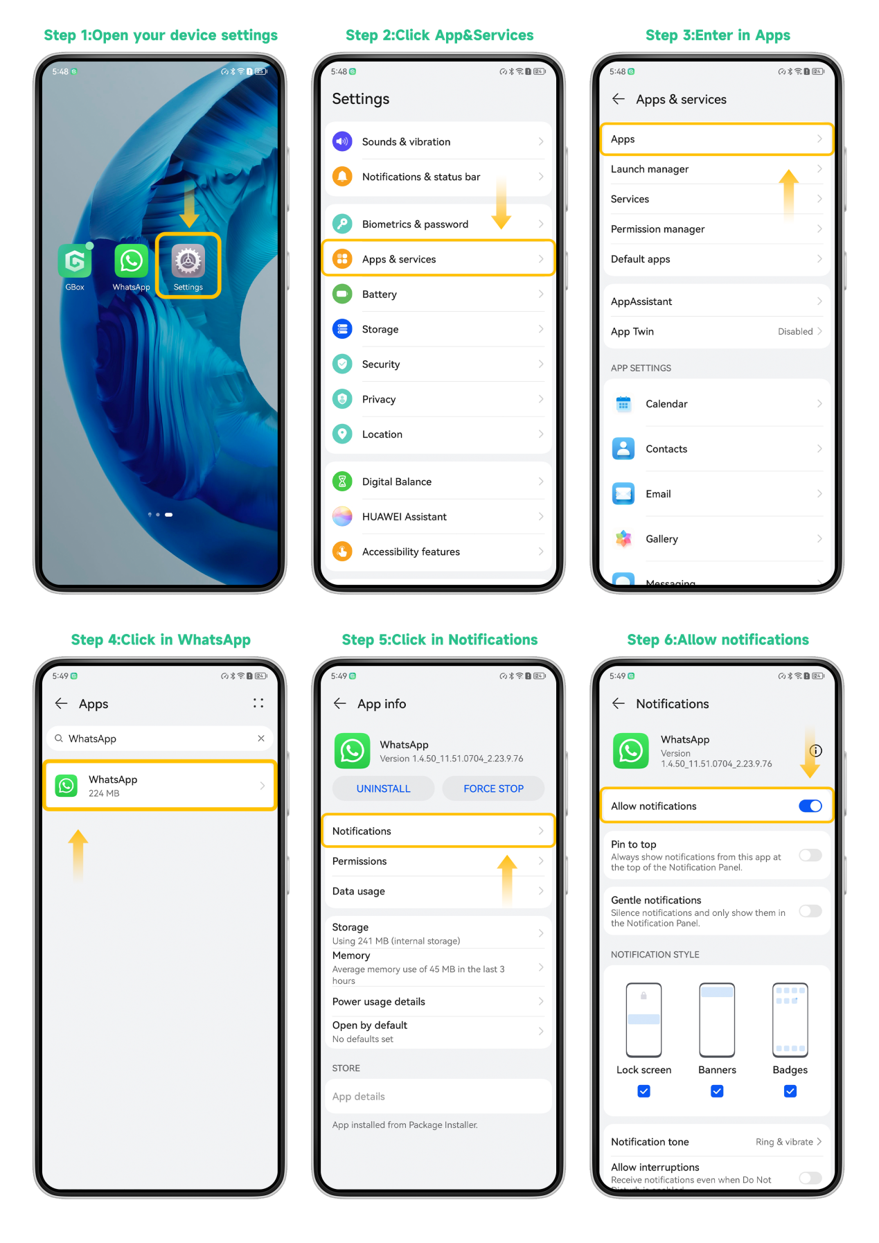 How to turn on GBox and all Apps' notifications? 1.Please follow those steps to turn on notification permissions for both GBox and other Apps. Device settings>> Apps&services>> Apps>> Select GBox and other Apps>>turn on Allow notifications.