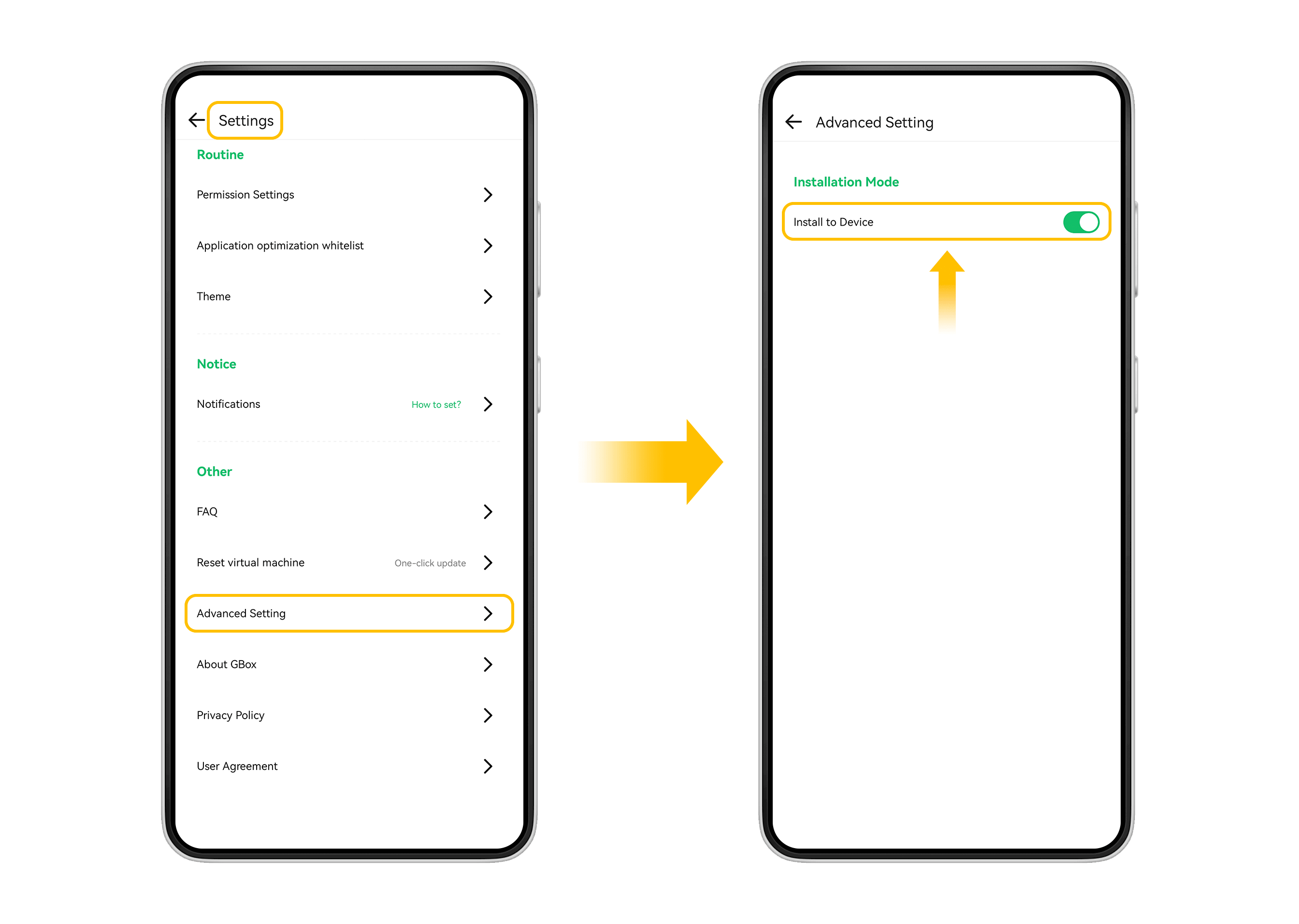 2. Starting from version 1.6.1,x, to continue installing apps within GBox, disable this feature by opening 'Advanced Settings' in GBox's 'Settings' and turning off 'Install to Device'. Once disabled, apps will remain installed in GBox.