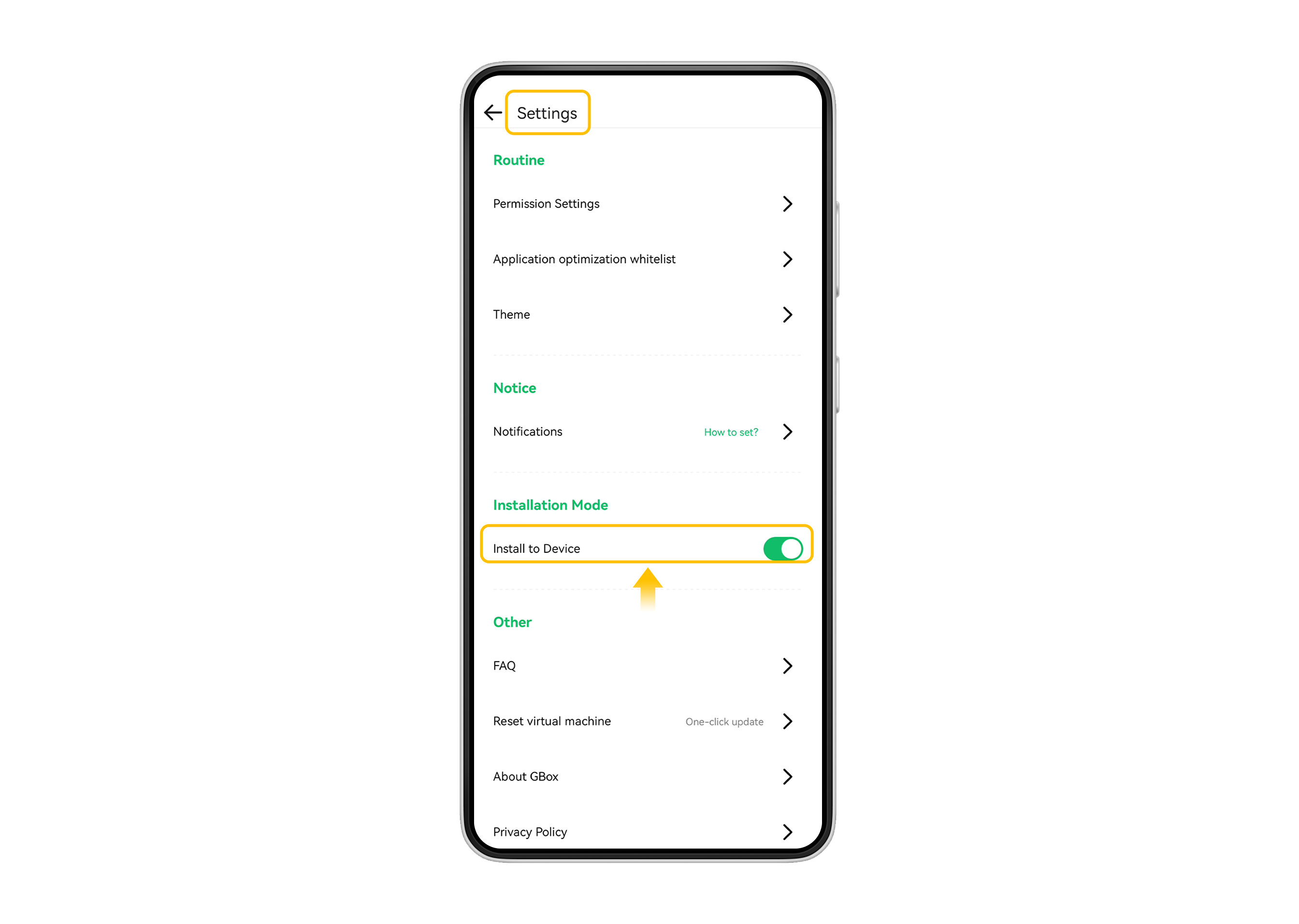 1. Between GBox versions 1.6.0 and 1.6.1, if you prefer to install apps within GBox, you can disable this feature by opening 'Settings' in GBox and turning off 'Install to Device'. Once disabled, apps will continue to be installed in GBox.